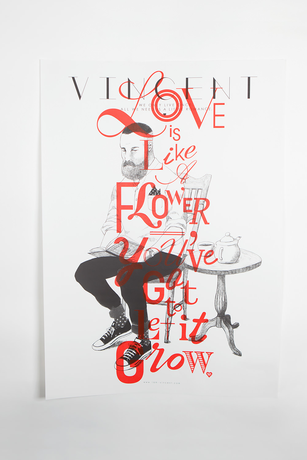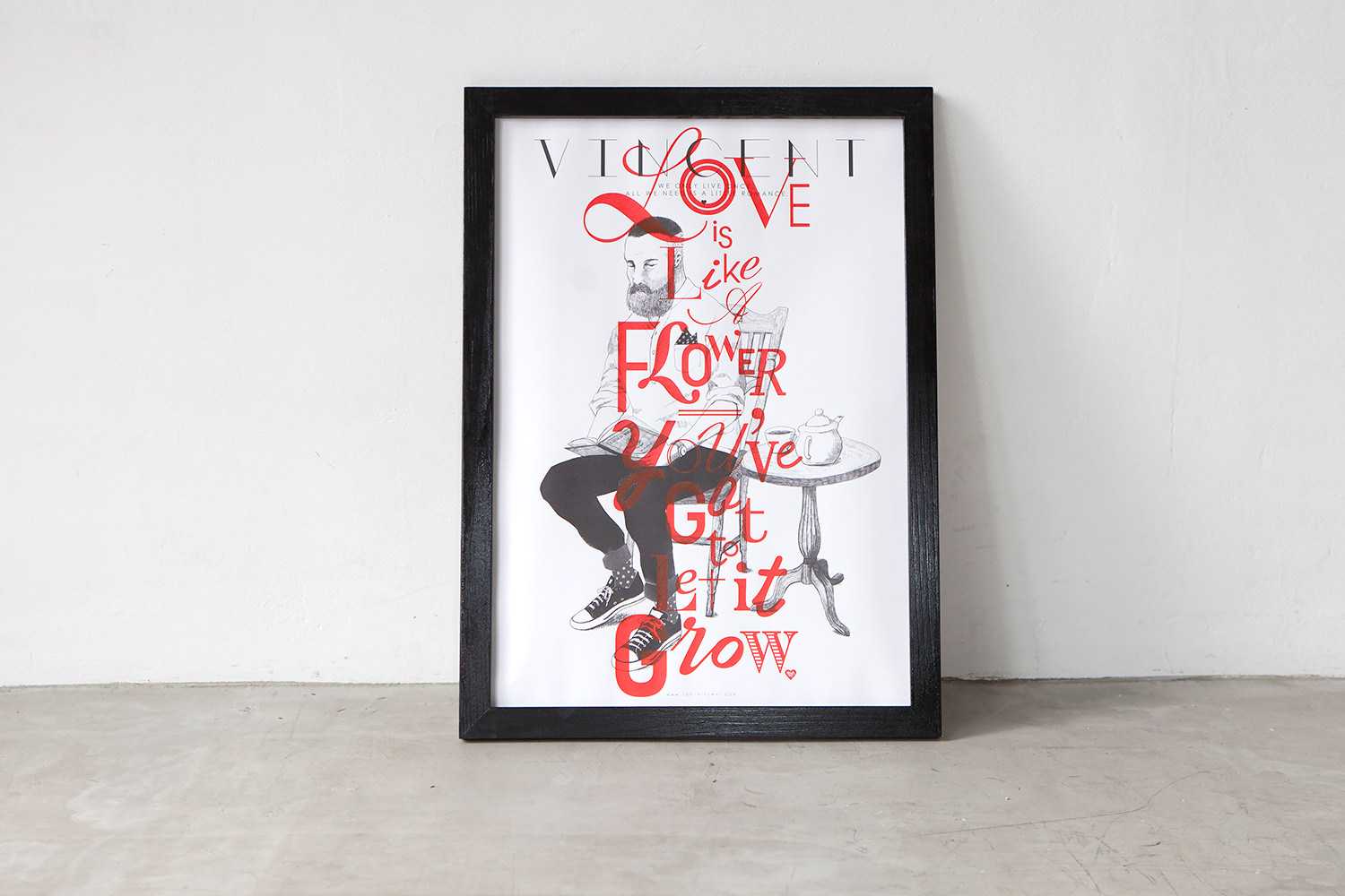 シャイで無骨、だけどどこか親しみを感じさせる、そんなヴィンセント氏を繊細で優しいタッチを用いて描いたポートレイト。その上に、ロマンチックなタイポグラフィ―を発色の良いシルクプリントを1枚ずつ丁寧に施した、記念すべき「VINCENT」の初作ポスター。