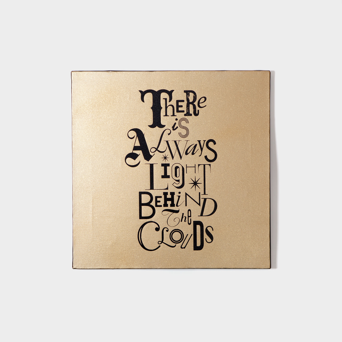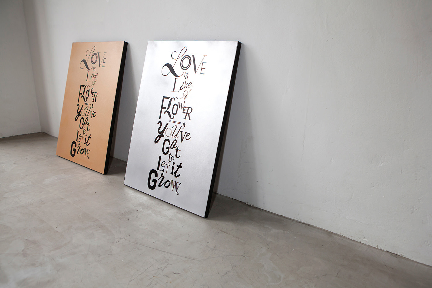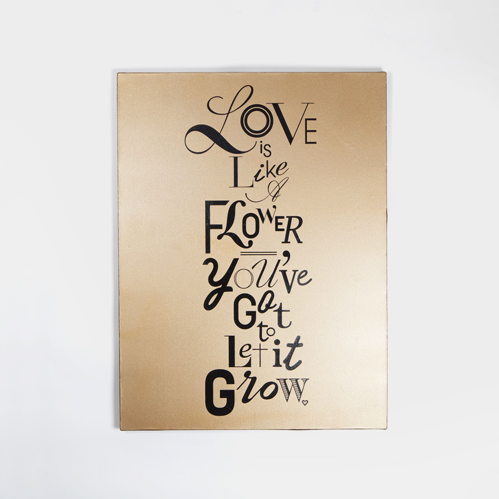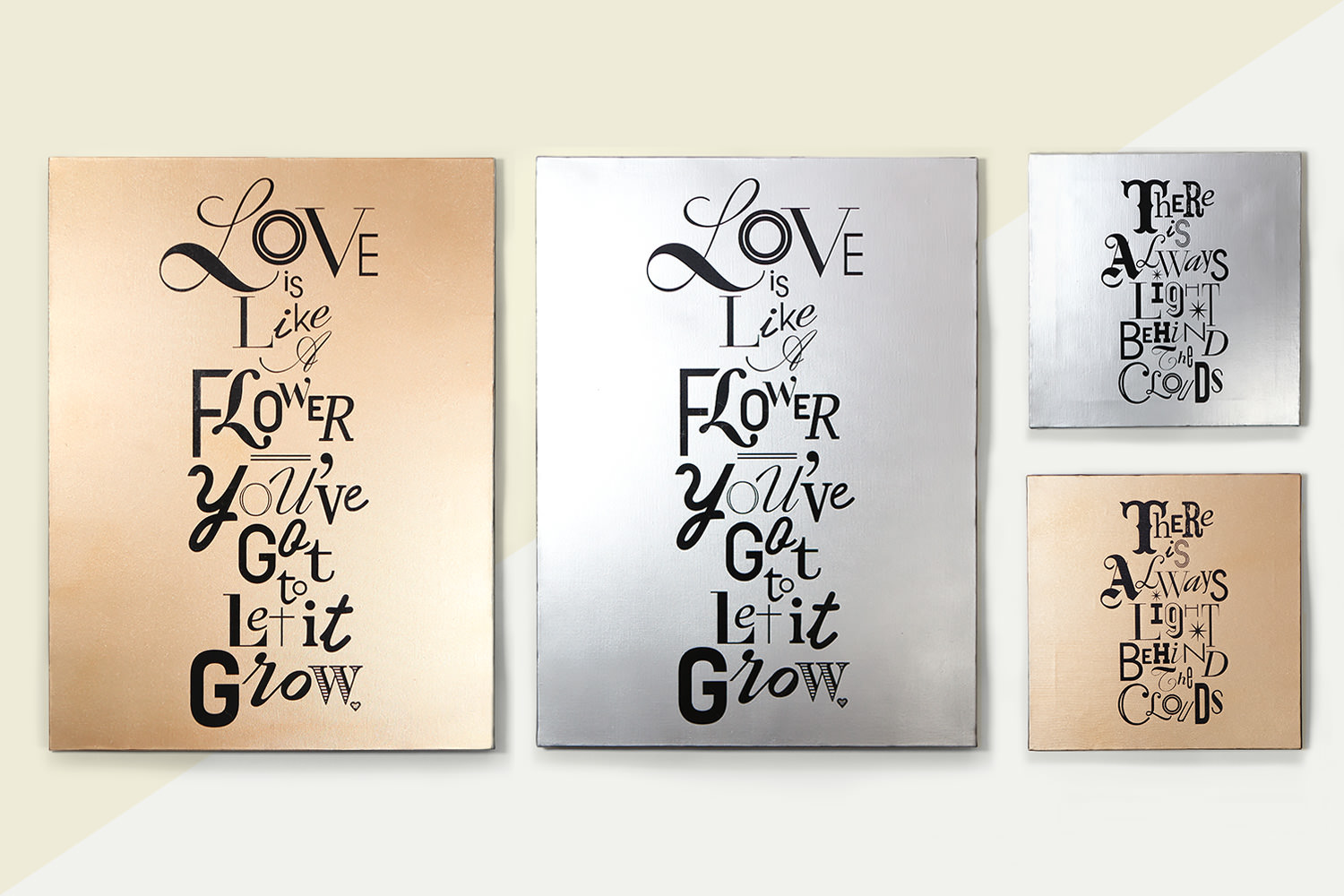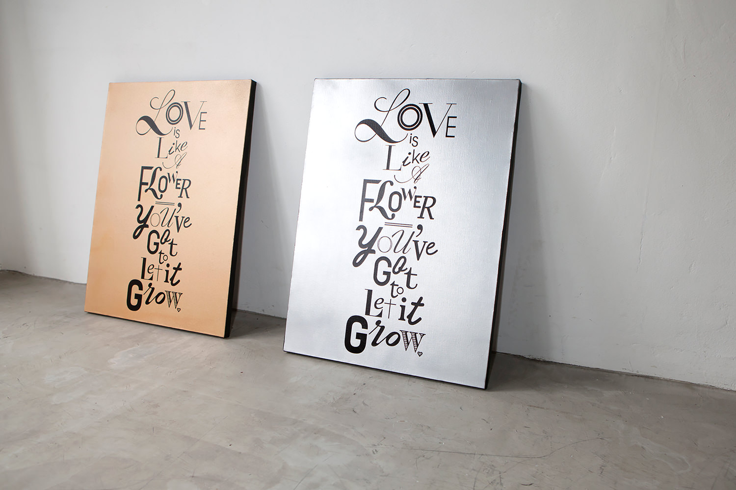目映い光に照らされて煌めくゴールド&シルバーに塗装されたキャンバスと、手作業で丁寧にプリントされたデザイン性の高いタイポグラフィ。一期一会とも言えるそのコントラストの美しさが魅力的な少量生産の限定アート作品、「Love on Canvas」。