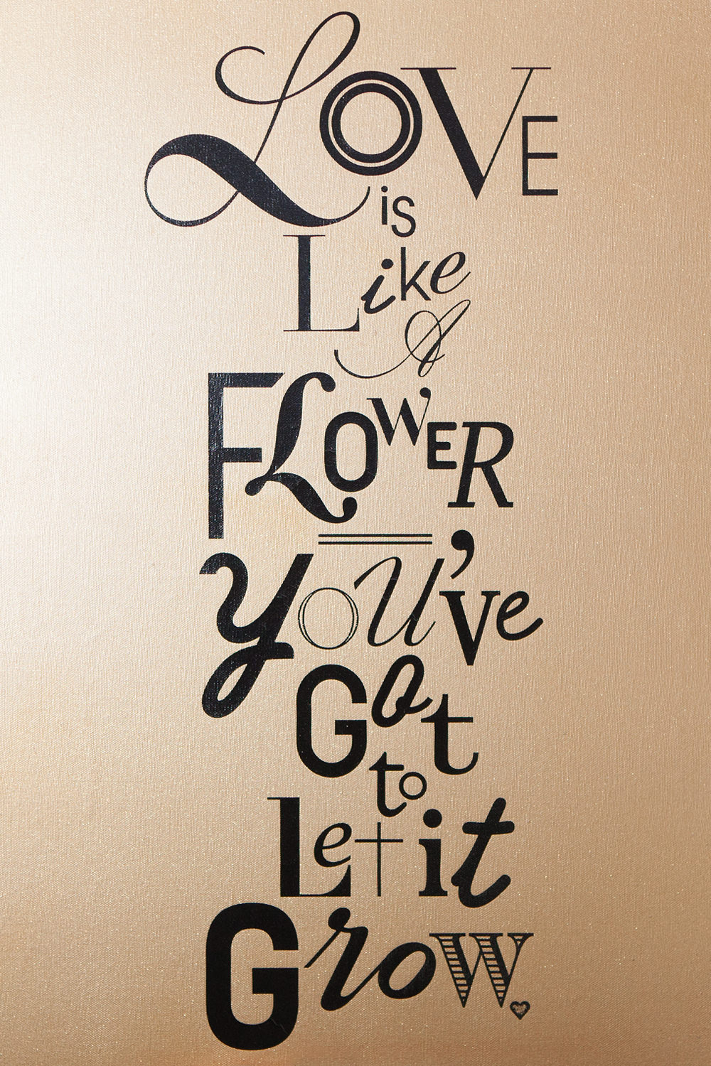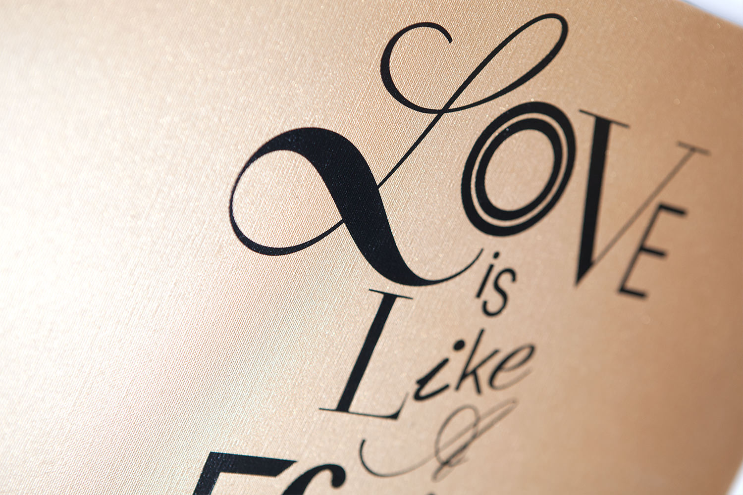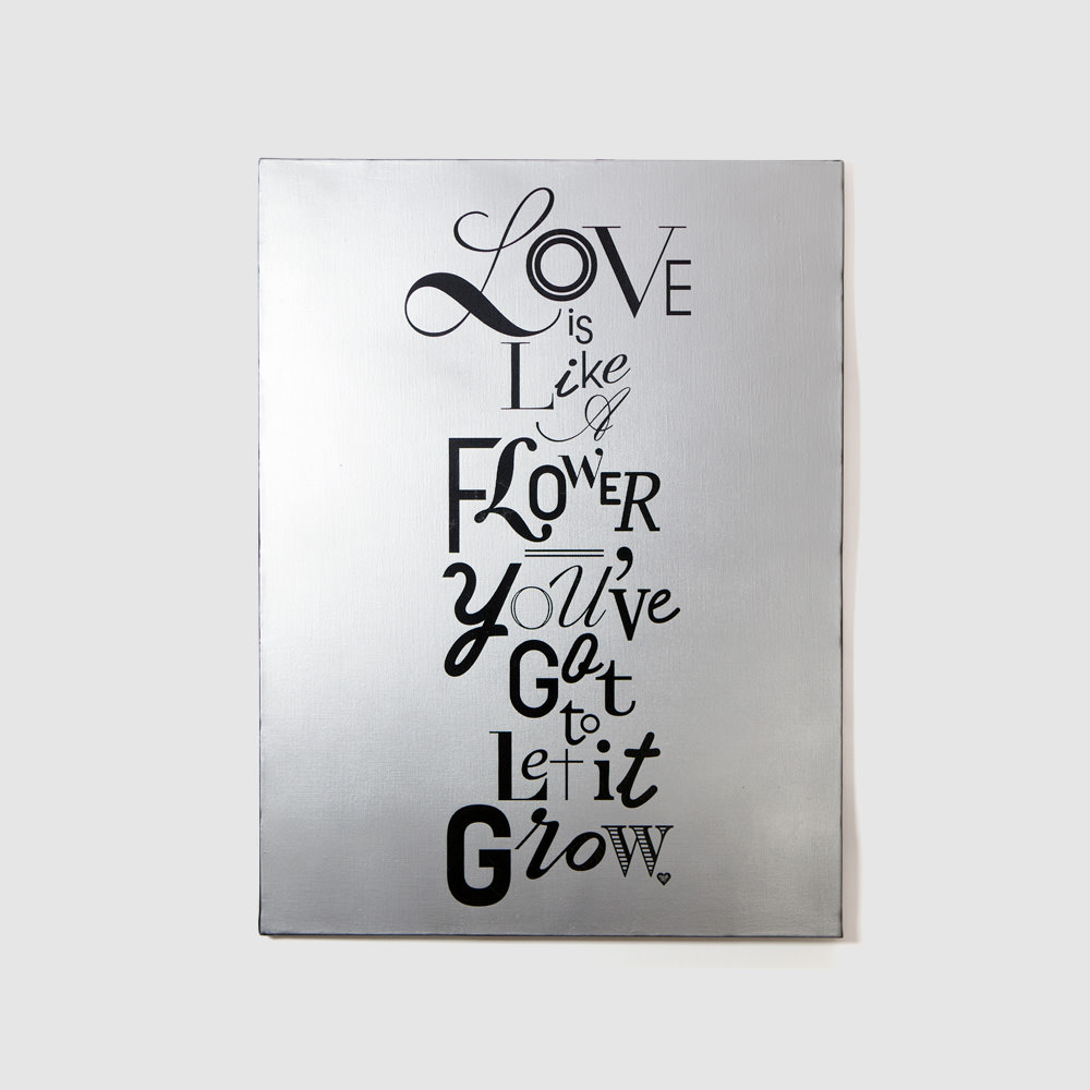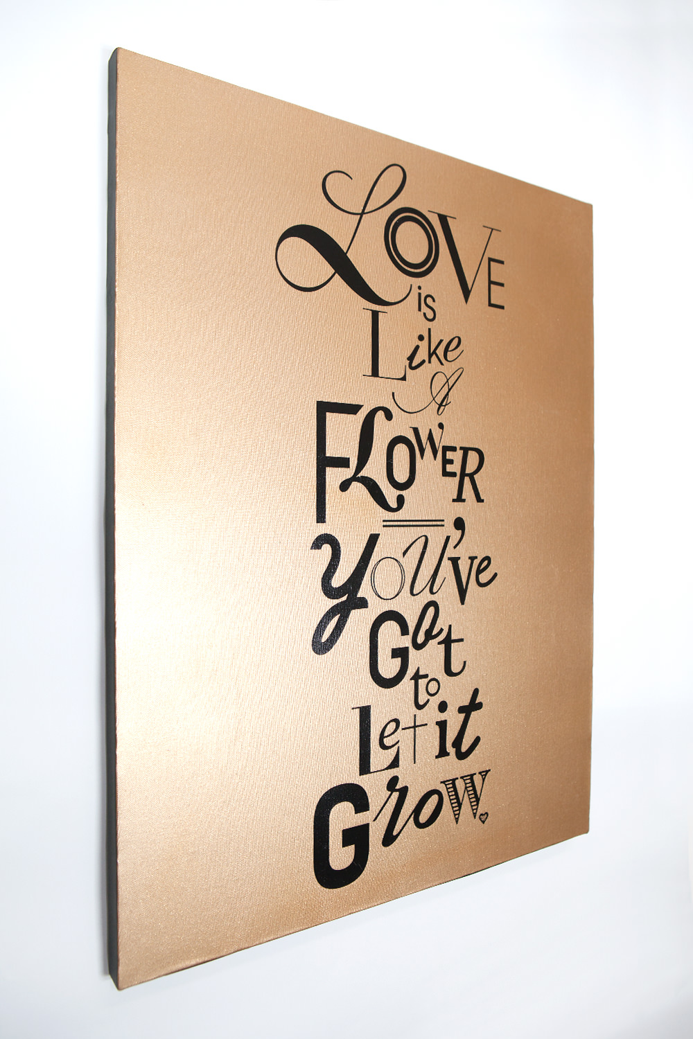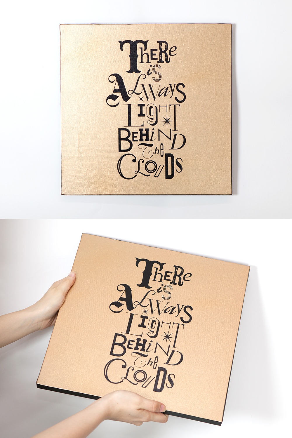 目映い光に照らされて煌めくゴールド&シルバーに塗装されたキャンバスと、手作業で丁寧にプリントされたデザイン性の高いタイポグラフィ。一期一会とも言えるそのコントラストの美しさが魅力的な少量生産の限定アート作品、「Love on Canvas」。