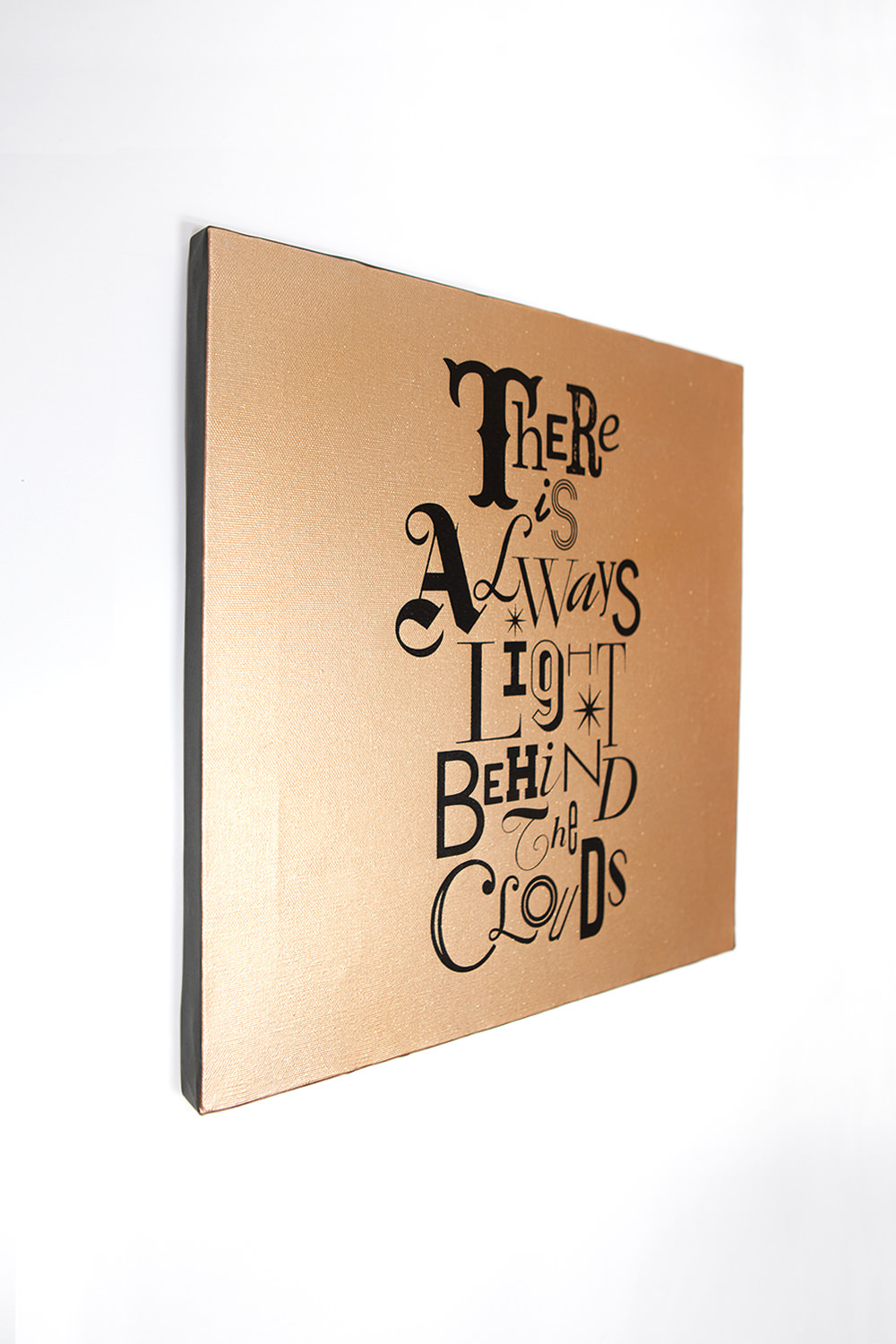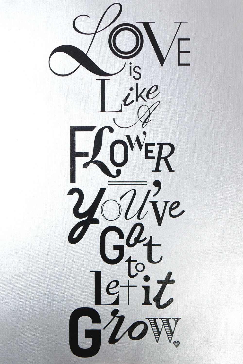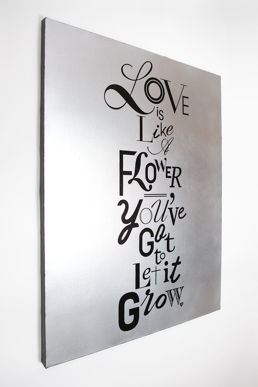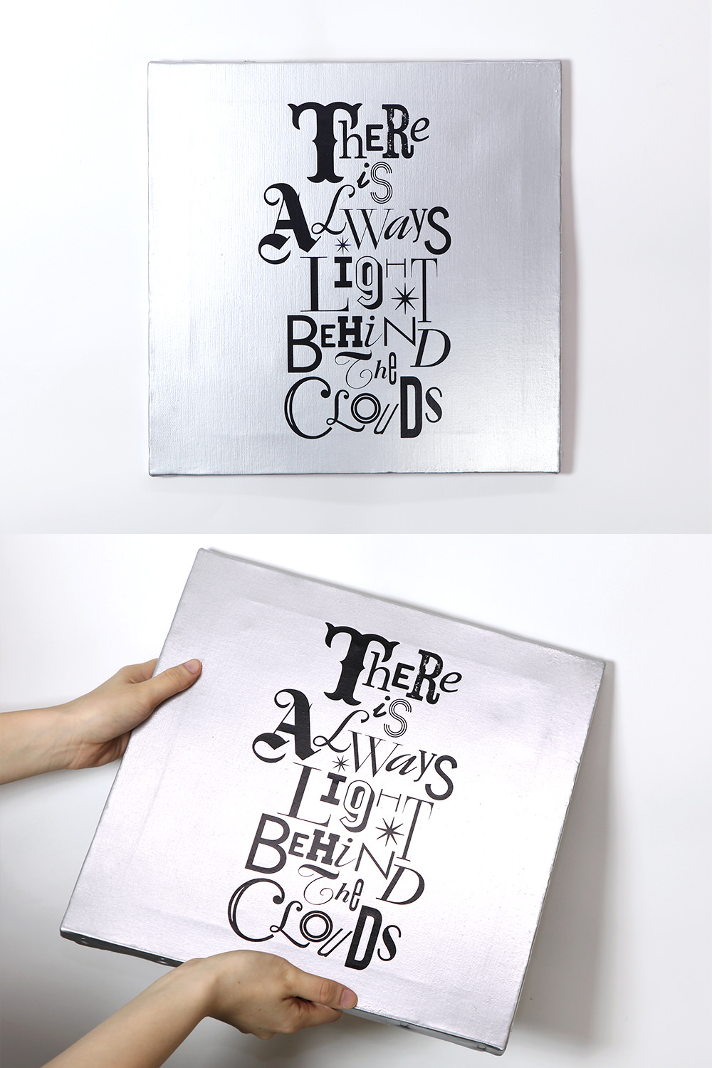 目映い光に照らされて煌めくゴールド&シルバーに塗装されたキャンバスと、手作業で丁寧にプリントされたデザイン性の高いタイポグラフィ。一期一会とも言えるそのコントラストの美しさが魅力的な少量生産の限定アート作品、「Love on Canvas」。