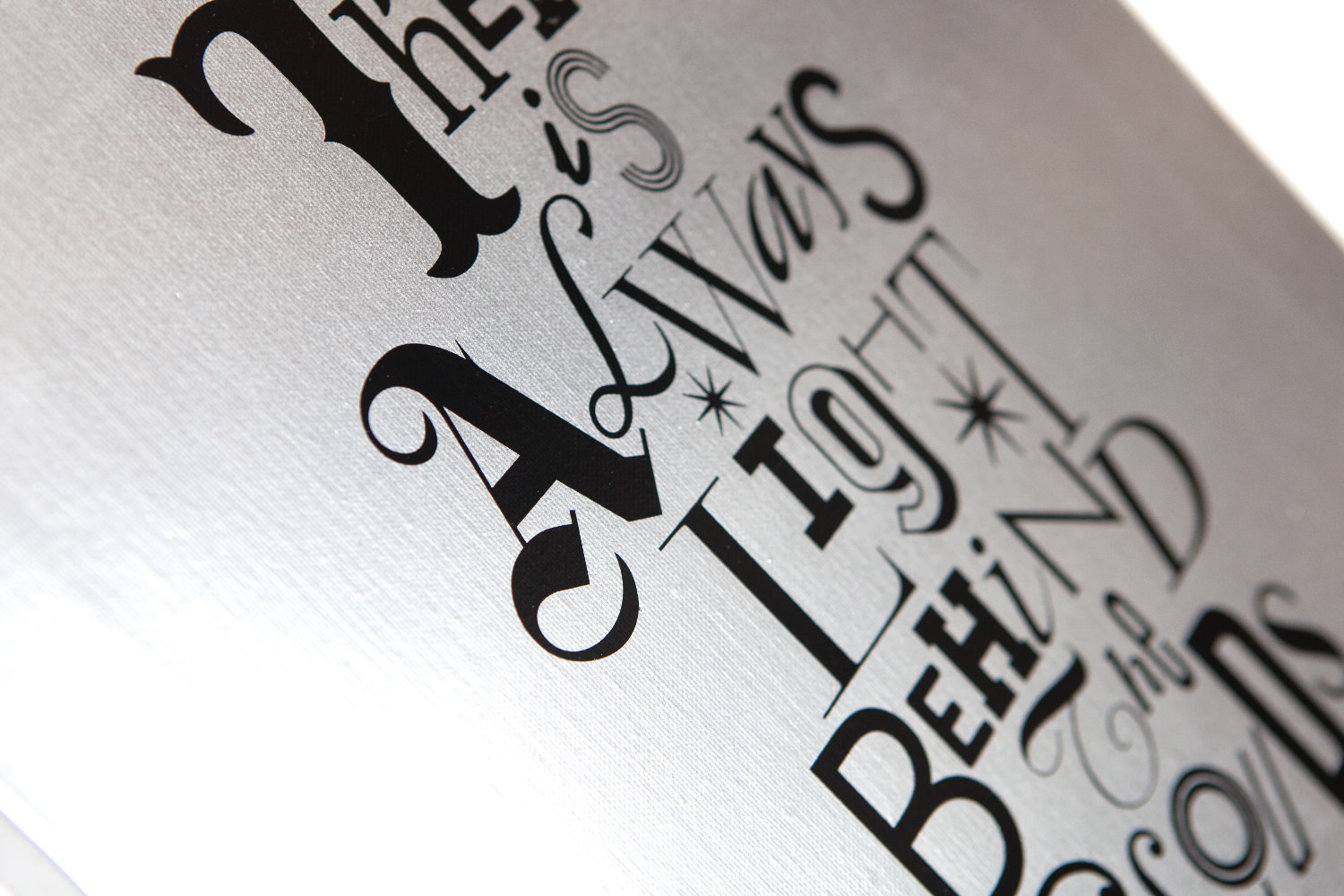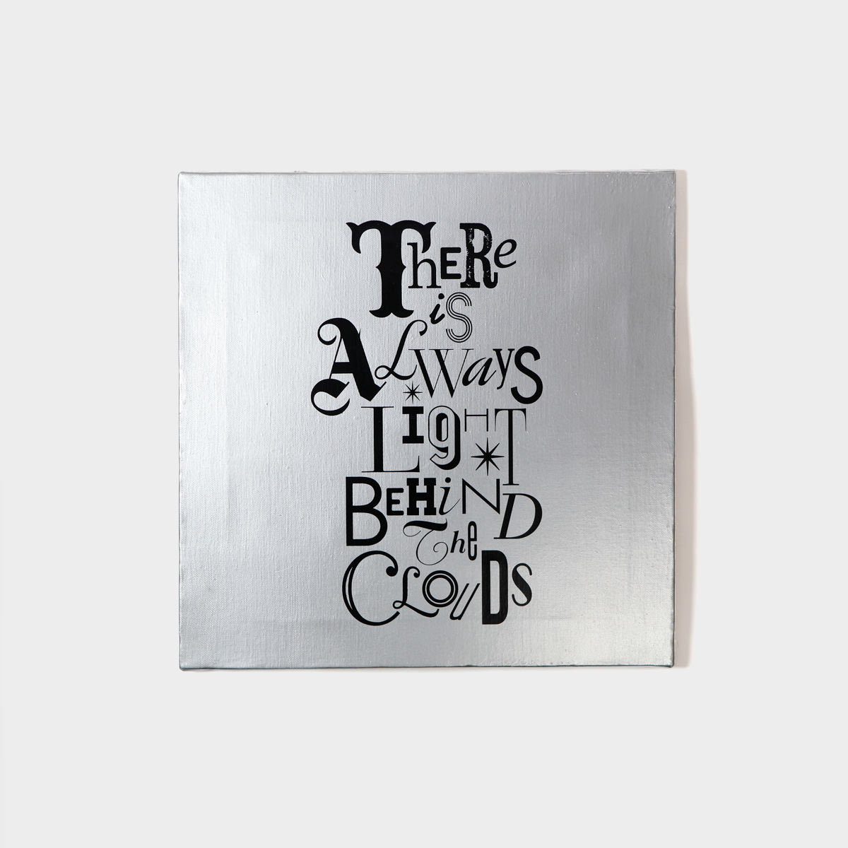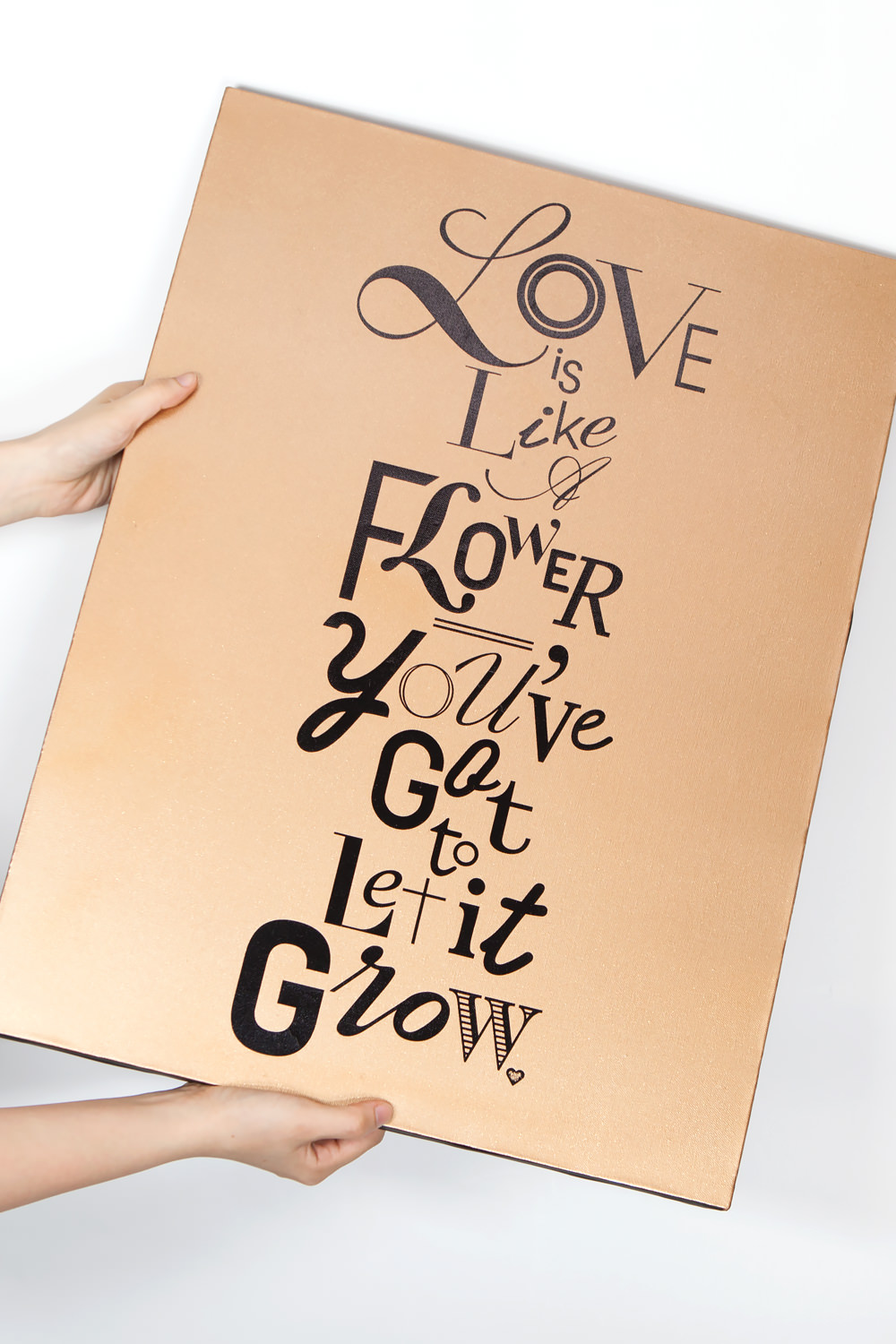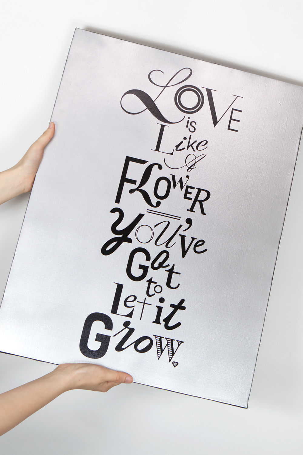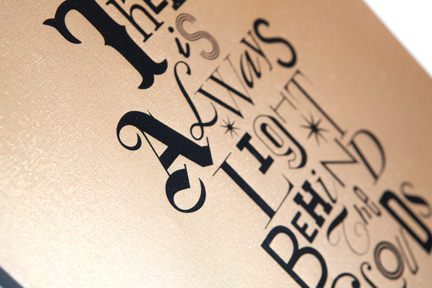 目映い光に照らされて煌めくゴールド&シルバーに塗装されたキャンバスと、手作業で丁寧にプリントされたデザイン性の高いタイポグラフィ。一期一会とも言えるそのコントラストの美しさが魅力的な少量生産の限定アート作品、「Love on Canvas」。