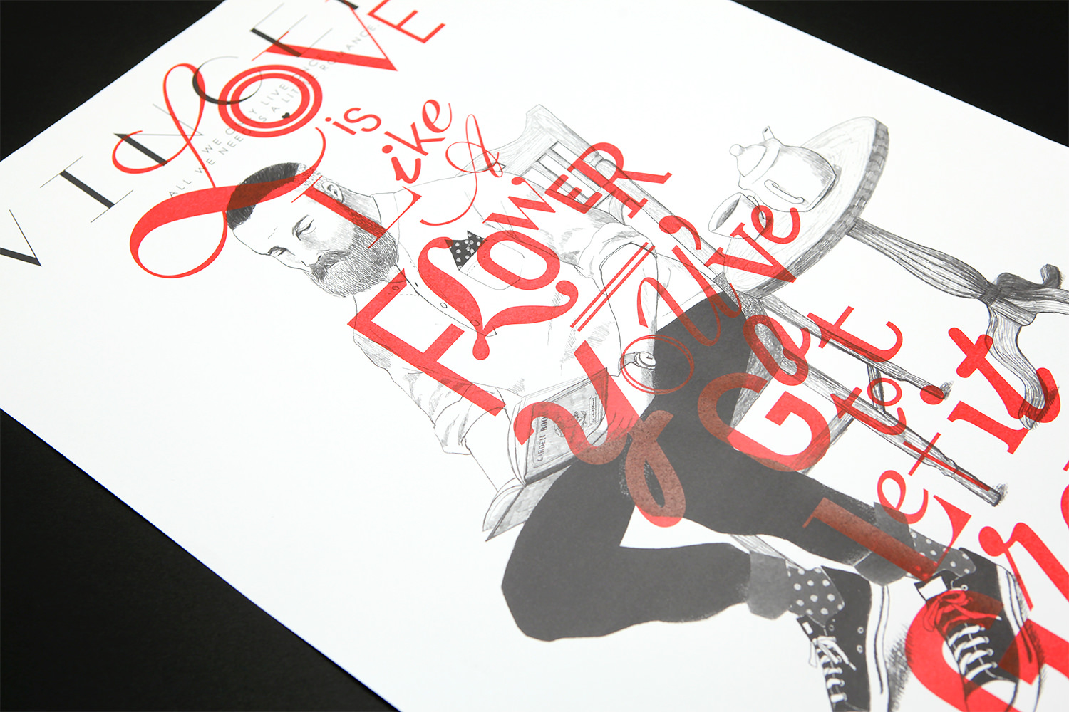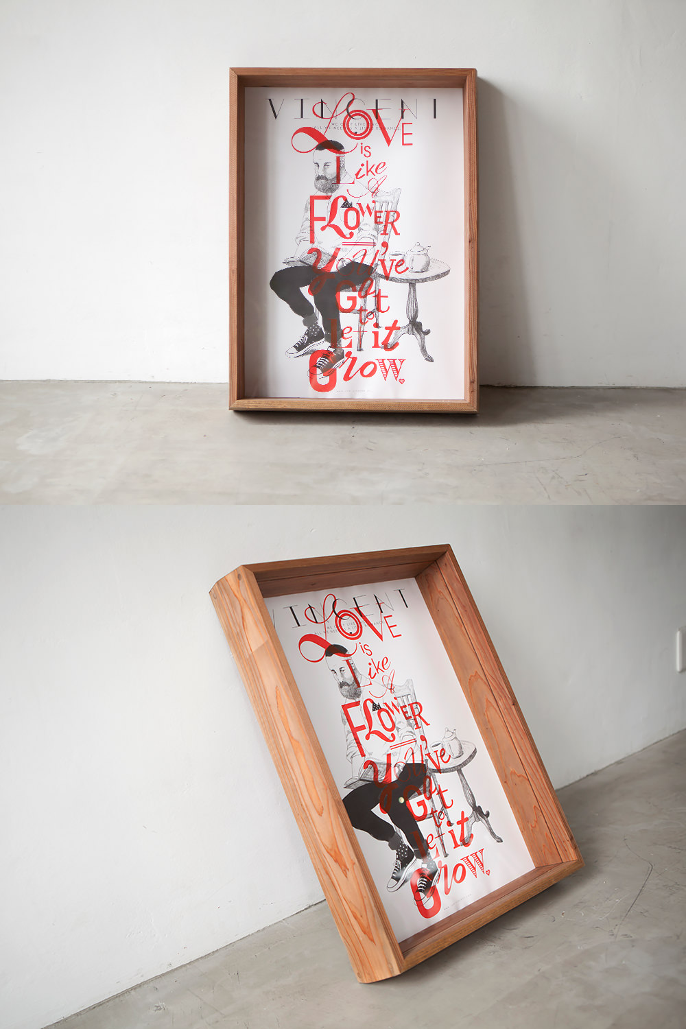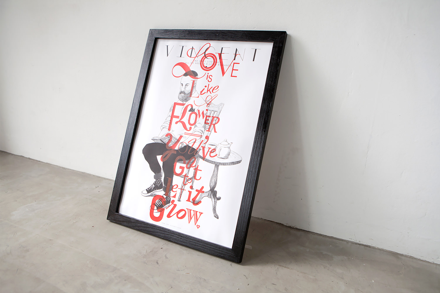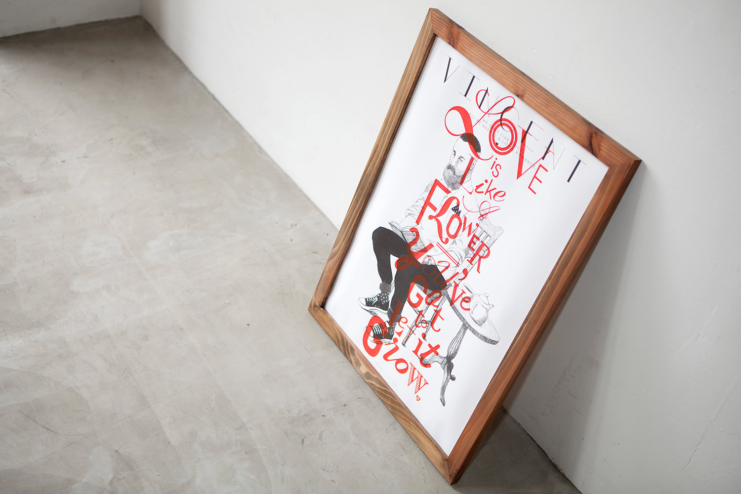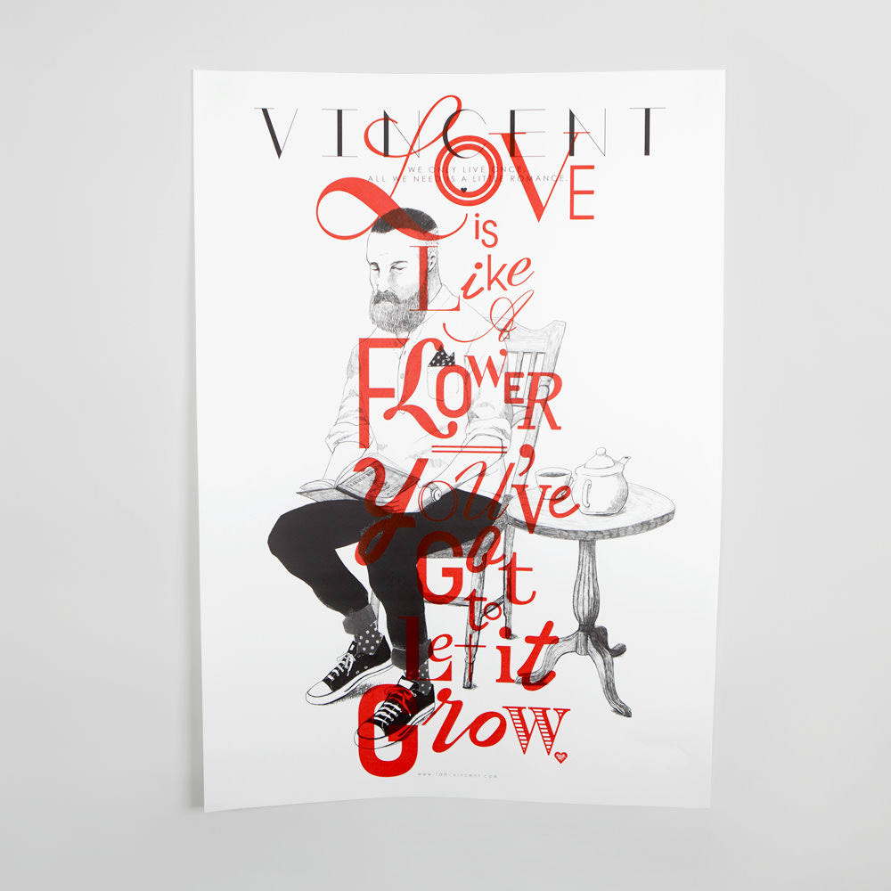 シャイで無骨、だけどどこか親しみを感じさせる、そんなヴィンセント氏を繊細で優しいタッチを用いて描いたポートレイト。その上に、ロマンチックなタイポグラフィ―を発色の良いシルクプリントを1枚ずつ丁寧に施した、記念すべき「VINCENT」の初作ポスター。