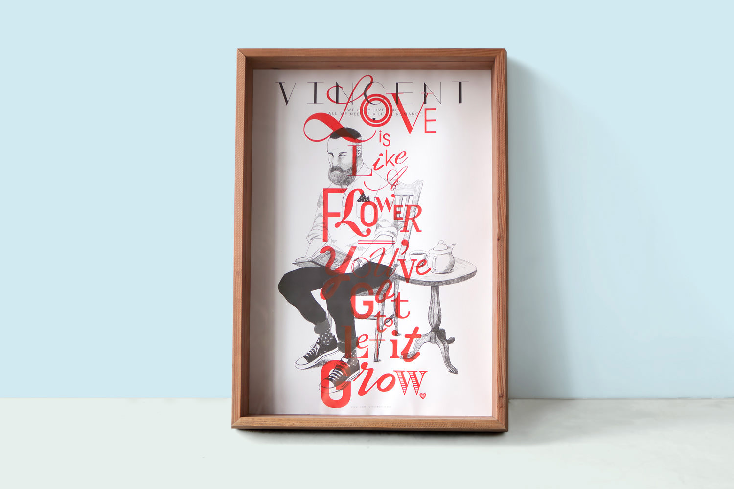 シャイで無骨、だけどどこか親しみを感じさせる、そんなヴィンセント氏を繊細で優しいタッチを用いて描いたポートレイト。その上に、ロマンチックなタイポグラフィ―を発色の良いシルクプリントを1枚ずつ丁寧に施した、記念すべき「VINCENT」の初作ポスター。